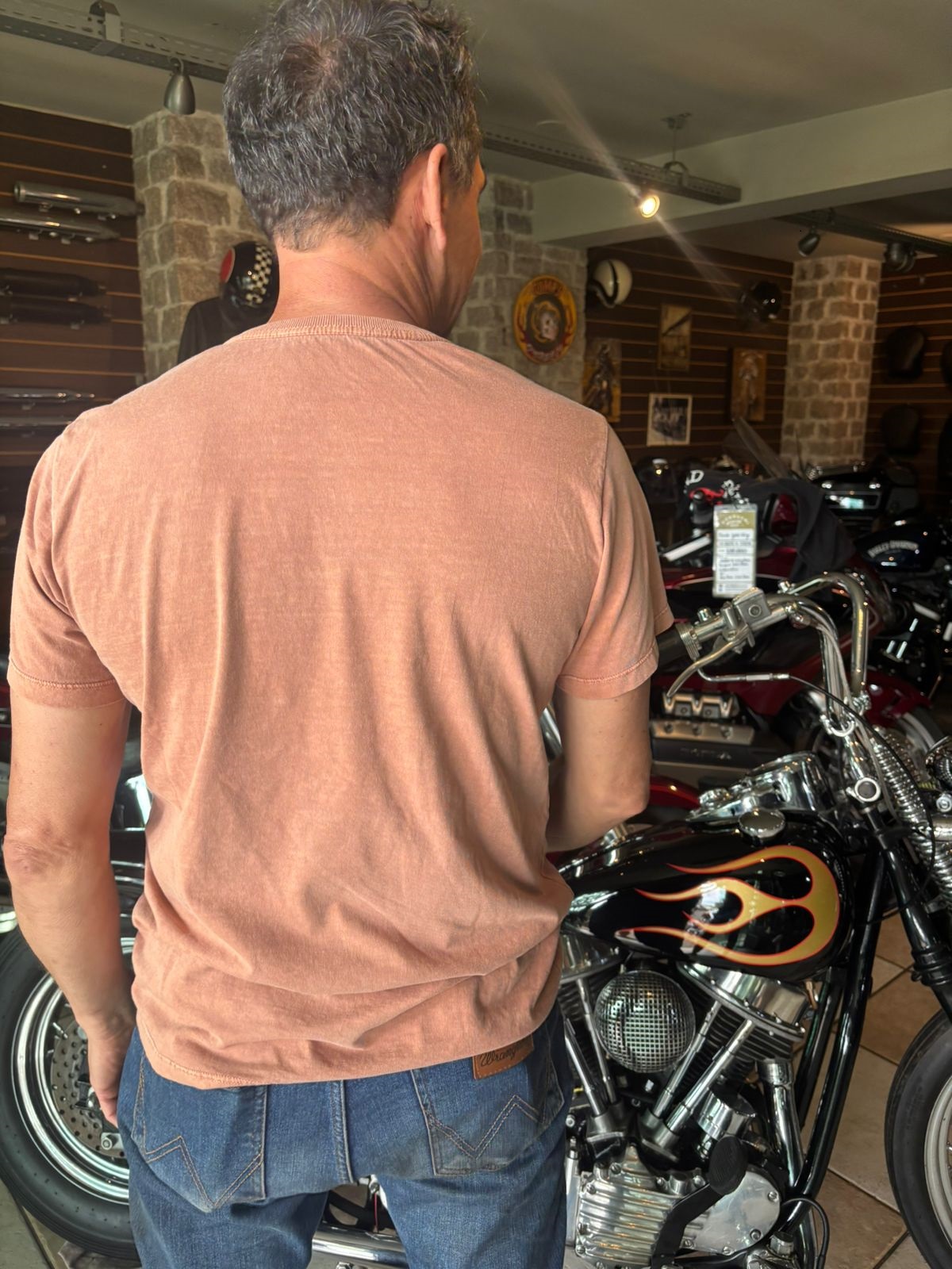 Camiseta de algodão fio 30 na cor tijolo com estampa na frente de uma Harley Davidson customizada.