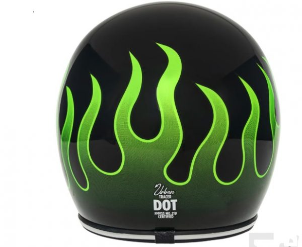 Urban Helmets preto com desenho de chamas na cor verde! Acompanha viseira bolha transparente.